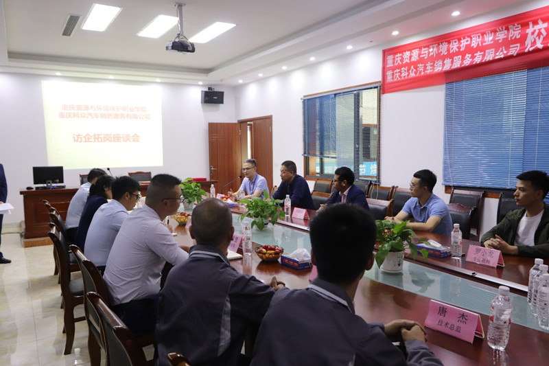 在访企拓岗暨校企合作签约的会议上,重庆科众汽车销售有限公司董事长刘春麟在致辞中讲到,科众汽车公司是大足区一家有20多年发展历史的民营企业,目前占地3000多平方米,年营业额4000多万元,员工100余名,其中维修技术员70余名,高级技师10余名,业务范围除了代理品牌的汽车销售、汽车售后外,还有其他品牌汽车的修理、美容等业务等,维修中设有宝马、奥迪、奔驰等高端汽车维修车间,有相当的汽车维修实力,公司的社会信誉和认可度很高,多次被大足区评为明星企业。此次签约即是为了支持当地职业教育的发展,也是为了解决公司发展中遇到的人力资源提升和技术攻关问题。公司愿意为公司汽车专业员工的校外实习实训和教师的企业实践创新条件、提供便利,今年可提供10人左右的毕业生就业岗位。